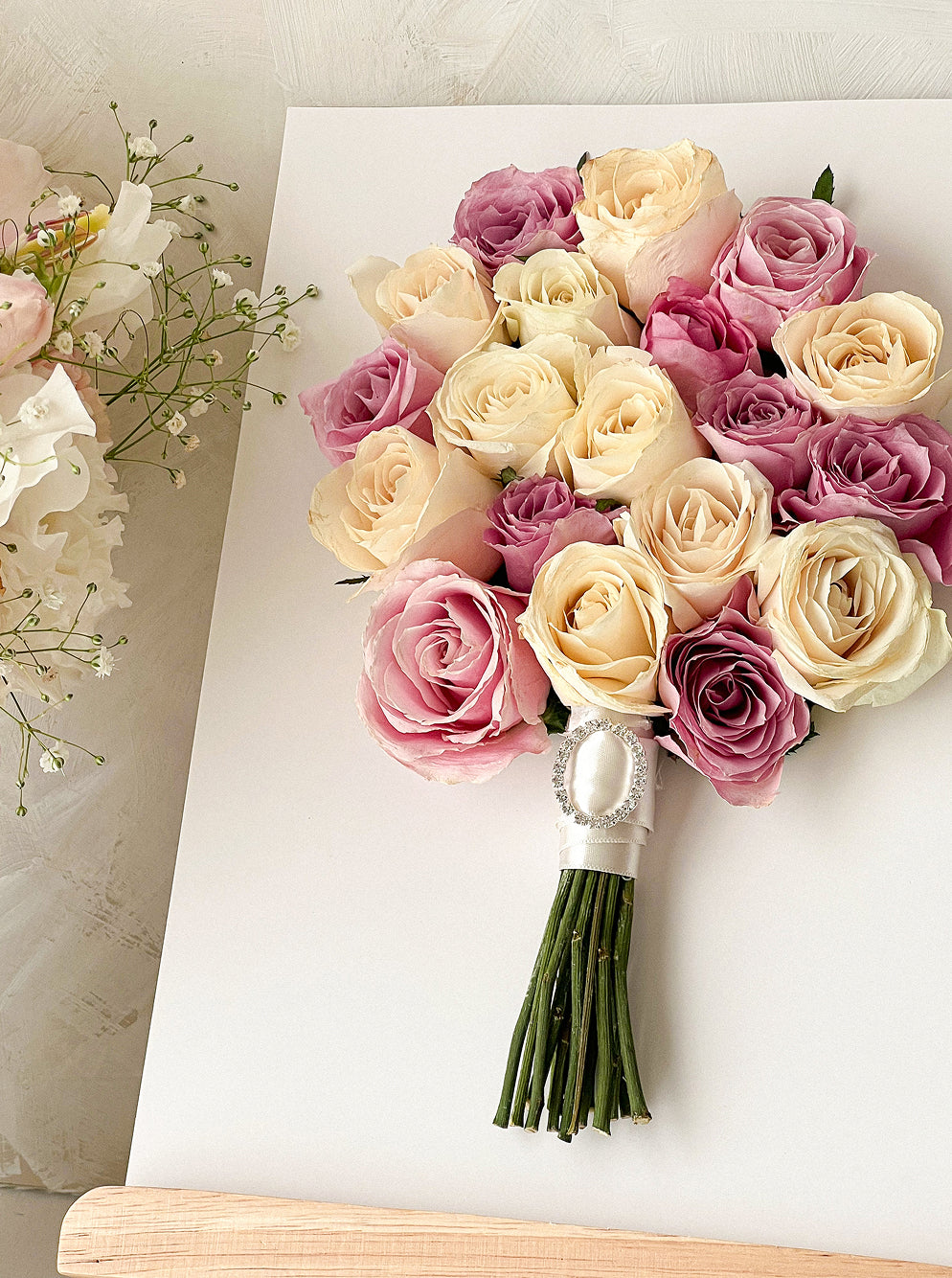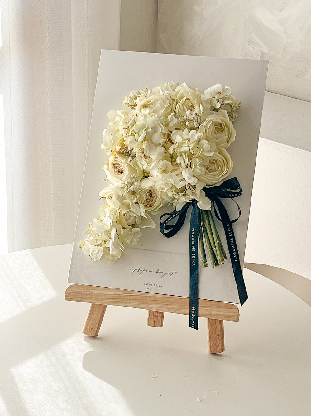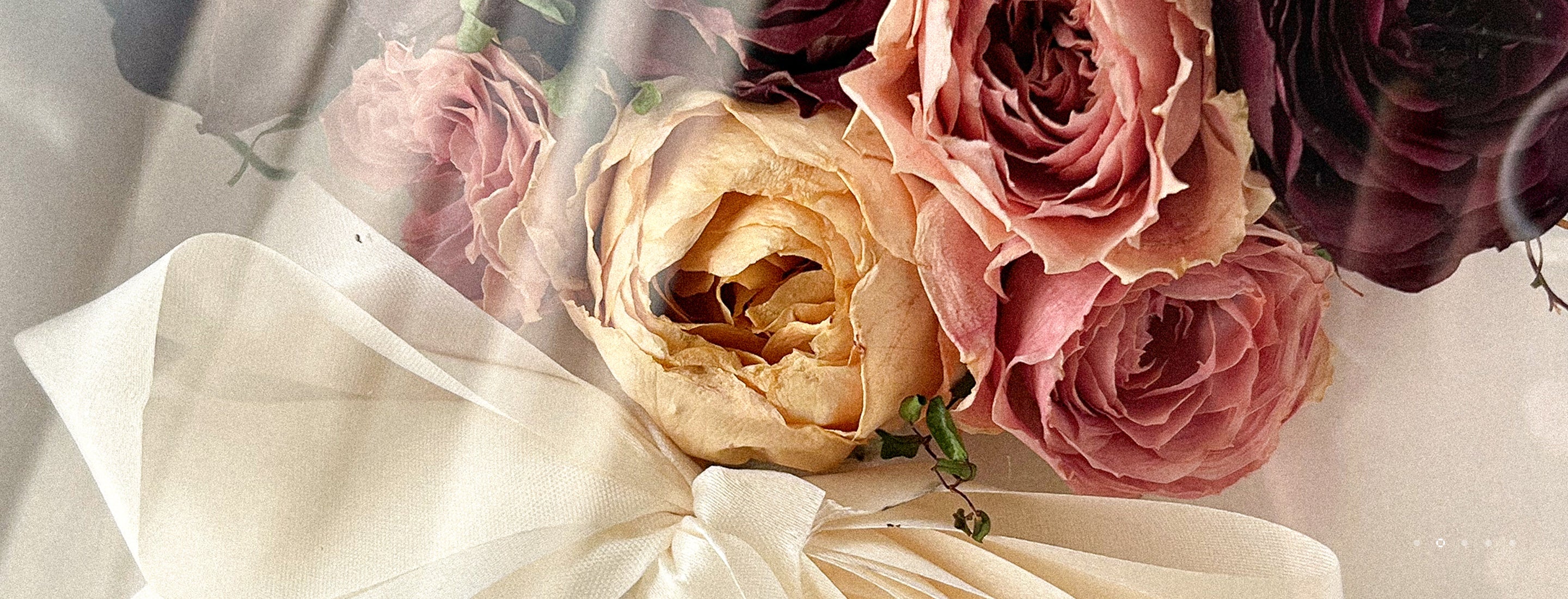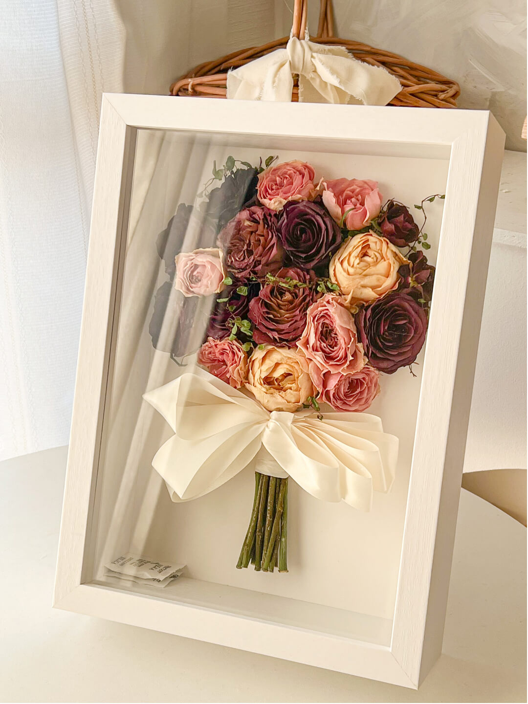 アフターブーケとは、結婚式やプロポーズで受け取ったブーケを、押し花やドライフラワーなどの加工技術を用いて保存し、美しく形として残したものです。